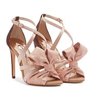 Crossover strap heeled sandal adorned with antique rose glitter bow detail.