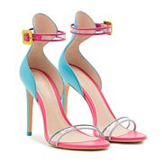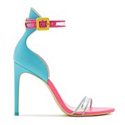 Turn heads in the Nicole sandal with flashes of magenta and turquoise and vinyl straps. The perfect party shoe.