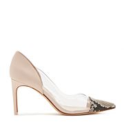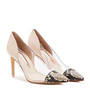 Chic leather and clear vinyl pump with dusty mid heel and natural snake print toe cap. Add the ultimate finishing touch to your Sophia Webster shoes with our Lorena Crystal Harness.