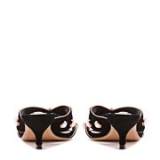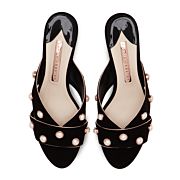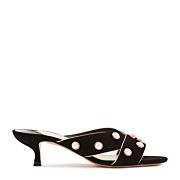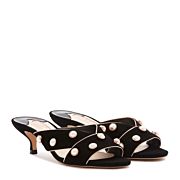Introducing the Amelie Mule, a flattering mid heel in black suede with gold piping and perfect pearl embellishment.