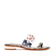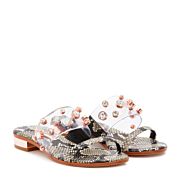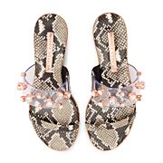 Slip into holiday mode with our Dina gem slides, with vinyl and gem top strap and finished in snake printed leather.