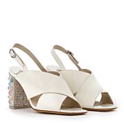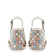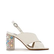 A luxurious cream patent upper cross strap and cute crystal buckle detailing, with a gorgeous pastel pearl mid heel makes for the perfect day to night sandal.