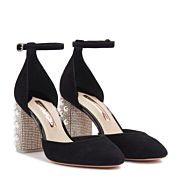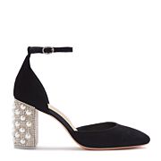 Beautiful black suede d'orsay pump finished with crystal and pearl 85mm heel for ultimate comfort.