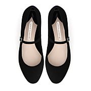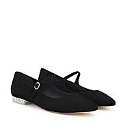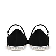 Beautiful black suede mary-jane flat with crystal and pearl detail heel. Finished with the sweetest crystal buckle.