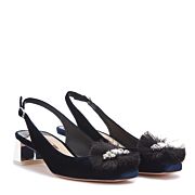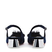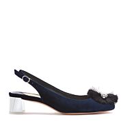 Inspired by the art nouveau style, in gorgeous navy blue velvet and featuring crystal and tassel embellishment in black and silver with a mirror finish block heel.
