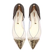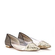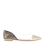 Pointed flat pump with clear vinyl side panel. Finished with a bronze and gold glitter, a gorgeous everyday style.